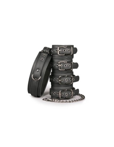Las posibilidades son ilimitadas con este set de ligaduras. Este set cuenta con un collar y esposas tanto para tobillos como para manos. Gracias a las hebillas de la cadena podrás quitarla muy fácilmente. Fabricado con cuero de imitación cuenta con espuma en el interior para que lo puedas llevar todo el tiempo que desees.
