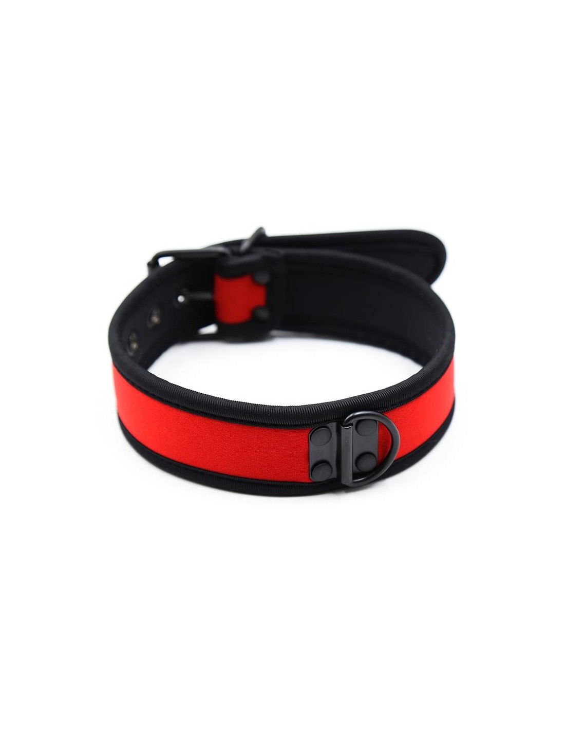 Collar de neopreno ajustable. Cuenta con color rojo llamativo, una hebilla para que lo puedas ajustar y una anilla en la parte delantera para que puedas usar con tu correa favorita, o con cualquier otro juguete compatible.